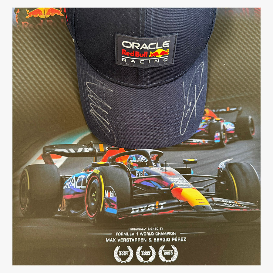 Personally signed 2023 Red Bull Racing F1 cap by the talented F1 World Champion Max Verstappen & team mate Sergio Perez.