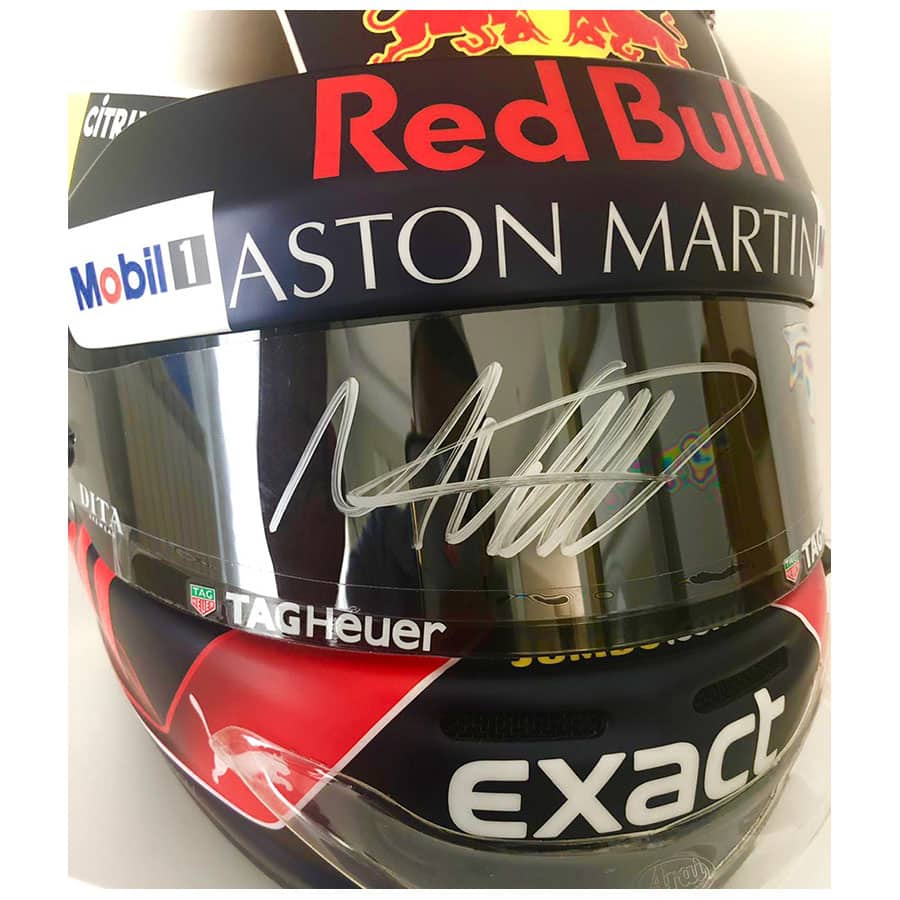 Elite Exclusives is offering an amazing opportunity to own a rare piece of F1 memorabilia – signed Max Verstappen helmet. Signed Arai GP-6S 2018 Promo helmet with FIA hologram with numbering (Helmet compatiible with FHR systems). This is the real deal and has been painted by Max’s own painters Jens Munser Designs (also with their JMD official hologram). The original Arai helmet is a reproduction of one worn by Verstappen during the 2018 season. This helmet was not used on track but likely used during photo shoots, hospitality or Red Bull Racing media events.